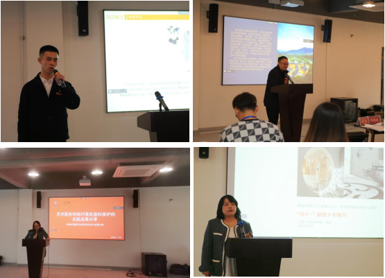 研究生代表趙二保、湖南力禾裝飾設(shè)計(jì)工程有限公司董事長(zhǎng)楊旭光、美術(shù)學(xué)院碩士研究生導(dǎo)師嚴(yán)茅、唐瓊做主題分享