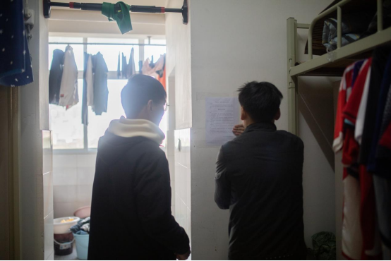 (圖為 男生寢室張貼“敲門行動(dòng)”消防安全告知書)