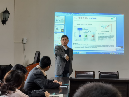 吳明娒教授首先介紹了近年來在單質(zhì)白光發(fā)光材料的設(shè)計(jì)以及在白光LED器件方面的工作,簡單展望了單質(zhì)白光發(fā)光材料的設(shè)計(jì)以及在白光LED器件的發(fā)展?jié)摿εc前景,指明該材料應(yīng)用于太陽能儲存,電池以及LED照明方面的發(fā)展優(yōu)勢與目前面臨的優(yōu)缺點(diǎn),闡述這一研究領(lǐng)域的發(fā)展方向,讓大家尤其是從事發(fā)光納米材料制備方向的師生擁有新的靈感。此外,吳明娒教授還與同學(xué)們分享了他的人生哲學(xué)道理與科研工作者該抱有的心態(tài),在座師生對吳明娒教授提出的的想法都表示贊同,并深受鼓舞。最后,與會教師及學(xué)生踴躍向吳明娒教授提問,吳明娒教授耐心對老師同學(xué)們的提問一一解答。此次講座讓與會師生受益匪淺。
