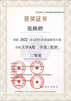 2022年10月31日,CATTI杯全國(guó)翻譯大賽決賽成績(jī)公布,我校外國(guó)語(yǔ)學(xué)院MTI教育中心2021級(jí)研究生張姝婷獲全國(guó)總決賽大學(xué)A組筆譯二等獎(jiǎng)(指導(dǎo)老師:黃靜)。該賽事從初賽、復(fù)賽到?jīng)Q賽歷時(shí)8個(gè)月,分為大學(xué)組、職業(yè)組、外籍組、通用組,報(bào)名人數(shù)超過(guò)8.1萬(wàn),參賽學(xué)校近1900所,創(chuàng)造了國(guó)內(nèi)翻譯比賽規(guī)模的新紀(jì)錄。經(jīng)過(guò)層層激烈角逐,我校MTI教育中心共三位研究生晉級(jí)決賽,其中王楠(指導(dǎo)老師:唐小田)、蔣安琪(指導(dǎo)老師:湯敬安)獲復(fù)賽大學(xué)A組筆譯三等獎(jiǎng)。