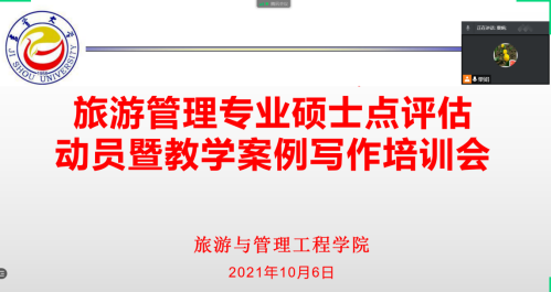 10月6日,旅游與管理工程學(xué)院召開旅游管理專業(yè)碩士點(diǎn)評估動員暨教學(xué)案例寫作培訓(xùn)會,會議由粟娟副院長主持,魯明勇院長、MTA全體導(dǎo)師、學(xué)生和部分校外兼職導(dǎo)師共60余人參會,由覃雯老師主講,以騰訊會議線上方式召開。