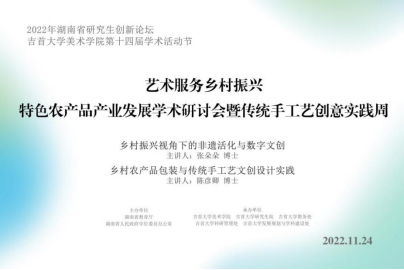 11月24日,2022年湖南省研究生創(chuàng)新論壇,吉首大學美術學院第十四屆學術活動節(jié),藝術服務鄉(xiāng)村振興——特色農產品產業(yè)發(fā)展學術研討會暨傳統(tǒng)手工藝創(chuàng)意實踐周,專題學術講座活動在線上線下同時進行。此次講座邀請了湖南大學設計藝術學院張朵朵博士、廈門理工學院陳彥卿教授作為主講嘉賓,我院趙忠鼎副教授擔任主持,校內外200余名碩士生及教師線上、線下參與。本次活動旨在搭建前沿的學術思想交流平臺,及時感知并把握時代的脈搏,積極探索設計藝術與鄉(xiāng)村振興發(fā)展研究的新思路、新方向、新模式。