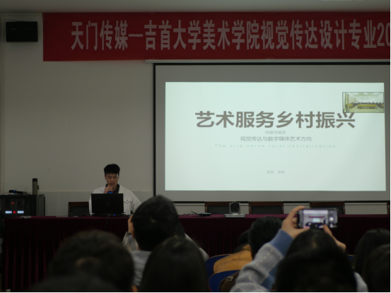研討會伊始,由吉首大學美術(shù)學院研究生李新、劉鑫銘、程玉三位代表,針對主會場內(nèi)容進行發(fā)言,隨后三位研究生分別從視覺傳達與數(shù)字媒體藝術(shù)、環(huán)境設(shè)計及美術(shù)創(chuàng)作三個方面談到了如何利用自己專業(yè)為鄉(xiāng)村振興服務。至此引發(fā)了研究生們根據(jù)自己的專業(yè)特點,向在場老師和3個研究生代表提出問題并發(fā)表自己見解,針對傳統(tǒng)村落的改造與保護、藝術(shù)服務鄉(xiāng)村振興等問題展開了研討。