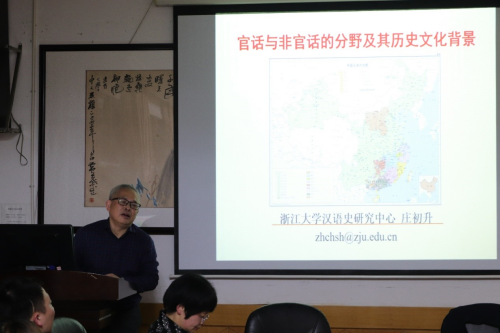 此次講座以官話與非官話的分野及其歷史背景為題,莊升初教授首先模仿湘西和西安等地區(qū)的官話,用以證明漢語方言的差異特別大,他認(rèn)為漢語方言作為我國的傳統(tǒng),已經(jīng)成為了我國大部分人的基本生活方式。