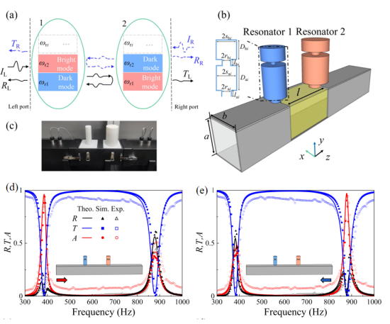 該研究工作利用一對含有不同輻射模式的多階亥姆霍茲共振器和通風波導(dǎo),在理論和實驗上實現(xiàn)了多頻帶的非對稱高效聲吸收和反射。設(shè)計策略是在每個共振頻率上實現(xiàn)聲學亮模式和暗模式的耦合,避免組裝多個功能單元所帶來的復(fù)雜性,在僅使用兩個多階共振器的情況下也能實現(xiàn)更多頻帶的非對稱吸收/反射。另外,通過靈活地部署多模對,構(gòu)造了一個混合多帶的非對稱系統(tǒng)。混合多帶非對稱系統(tǒng)的一側(cè)幾乎完全地吸收低頻的入射聲波,反射高頻的入射聲波;相反,另一側(cè)有效地反射低頻入射波,同時吸收高頻入射波。該研究工作展示了定制多頻非對稱吸收的靈活性,為通風型吸聲器、聲波操縱裝置的設(shè)計提供了一種方法。