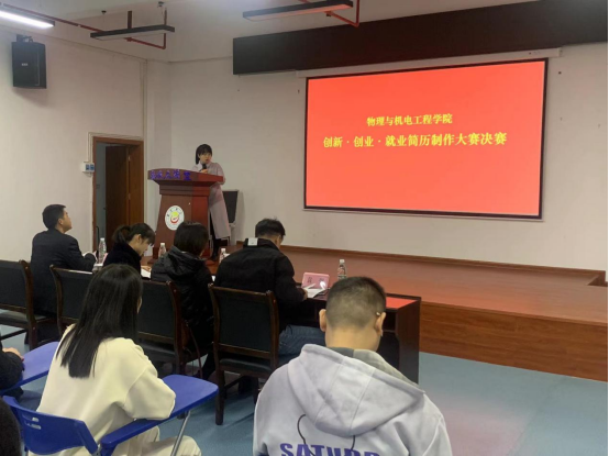 (通訊員 言西早)為使學(xué)院學(xué)生充分意識到簡歷在求職過程中的重要性,為同學(xué)們提供一個鍛煉自我的平臺,12月3日中午,物理與機電工程學(xué)院在第十二教學(xué)樓A101會議室舉行創(chuàng)新·創(chuàng)業(yè)·就業(yè)簡歷制作大賽,學(xué)院黨委副書記許斌、學(xué)工辦主任朱姍姍、研究生秘書伍建華、團委書記譚艷文、輔導(dǎo)員袁強擔(dān)任此次評委。大賽由學(xué)院團委書記譚艷文主持。