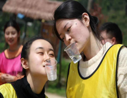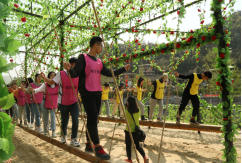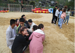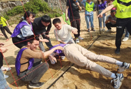 一頓美味的湘菜過后,“眾人蕩秋千”游戲項目開始。這個項目非常考驗參與人員的肢體協(xié)調(diào)能力,前后搖擺著的細長木板上承載著多人重量的同時也帶來了緊張刺激感,大家緊握住身體兩側(cè)的麻繩,深怕一個不小心從秋千上掉下去。