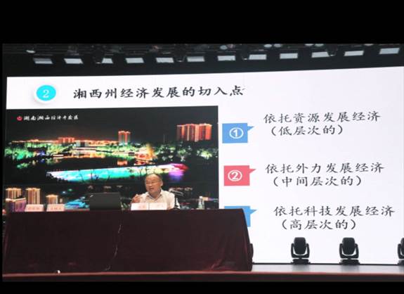 講座開始,宛慶豐副主任通過大量數(shù)據(jù)分析了湘西州經(jīng)濟發(fā)展狀況,客觀、嚴謹?shù)貫橥瑢W們展現(xiàn)了湘西的經(jīng)濟狀況。隨后,宛慶豐副主任從礦產(chǎn)資源優(yōu)勢、旅游資源優(yōu)勢、生態(tài)資源優(yōu)勢、民族文化資源優(yōu)勢四個方面為大家介紹了湘西州的資源優(yōu)勢。期間,他指出,我們要依托資源發(fā)展經(jīng)濟、依托外力發(fā)展經(jīng)濟、依托科技發(fā)展經(jīng)濟。講座最后,他語重心長地說:經(jīng)濟發(fā)展不能犯顛覆性錯誤,瞎指揮,以犧牲環(huán)境和生命安全為代價;經(jīng)濟發(fā)展要因地制宜,咬定目標,久久為功,持續(xù)發(fā)力,不改弦易張。新生們在聆聽講座中秩序井然,表示出了極大學習興趣。講座結(jié)束,現(xiàn)場響起了熱烈的掌聲。